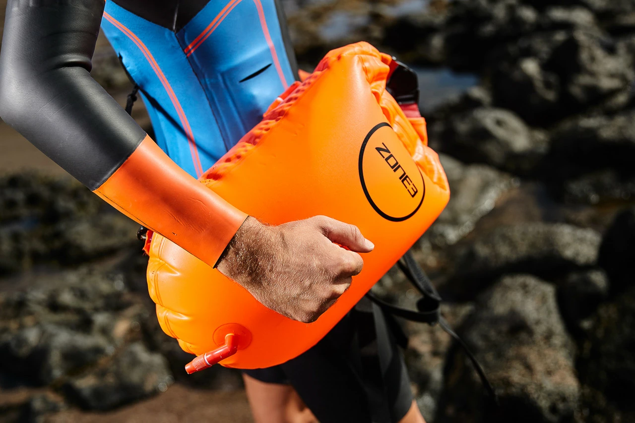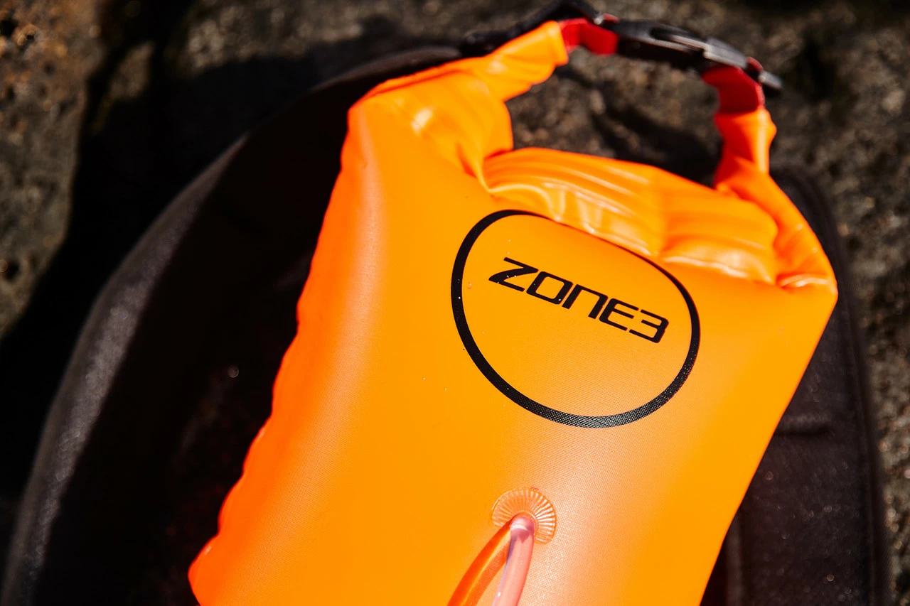 The Zone3 dry bag features dual air bags, to be inflated once the bag is filled with training gear. The inflation chambers are separate from the storage area, thus providing more buoyancy than just a normal dry bag.